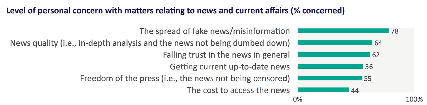 Here’s their summary of the research findings: “Almost two-thirds of respondents (62%) stated they were personally concerned about ‘the falling trust in the news in general’. More specifically, 78% said they were concerned about the ‘spread of fake news and information’, while 64% said they were concerned about the quality of the news (which we defined as ‘in-depth analysis and the news being dumbed down’).”