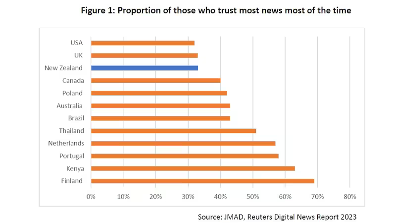 For the first time, New Zealand’s trust score is lower than the global average of 40 per cent, recorded by Reuters Institute’s Digital News Report. And it’s now like that of the US (32 per cent) and the UK (33 per cent). See how other nations compare in the chart below: