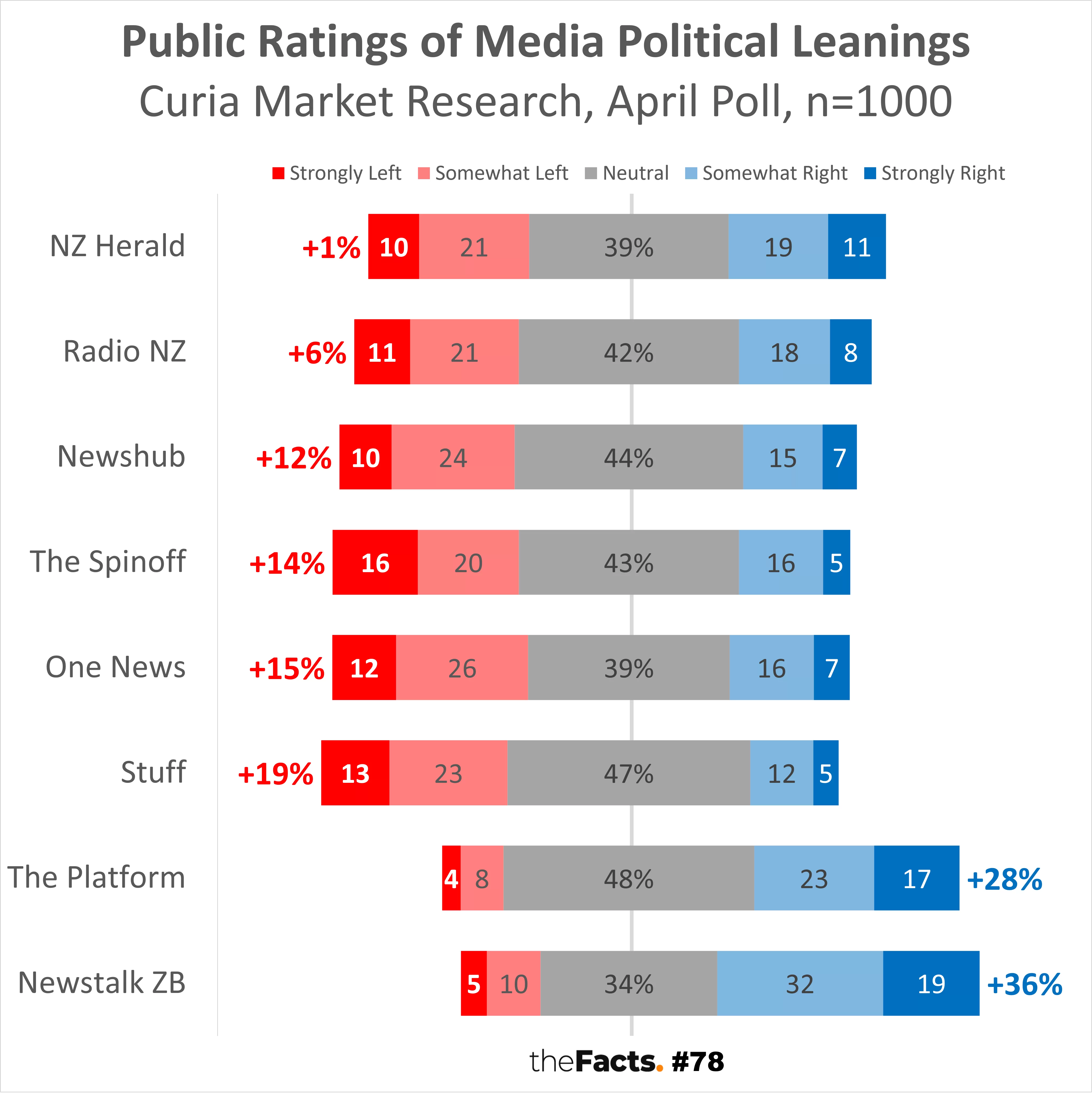 Similarly, the same research company asked the public to identify where on the left-right political spectrum each of the main media outlets was in April last year. The results suggested that the NZ Herald was the most politically balanced media outlet, with very similar left and right scores – see: NZ Herald rated as NZ’s most politically balanced media outlet